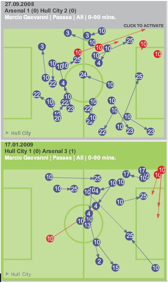 Compare Geovanni’s performance at the Emirates to the corresponding fixture at KC Stadium in January (see below). He made far fewer passes and those that he did make were further up the pitch - demonstrating less of a desire to drop deep to help the team.